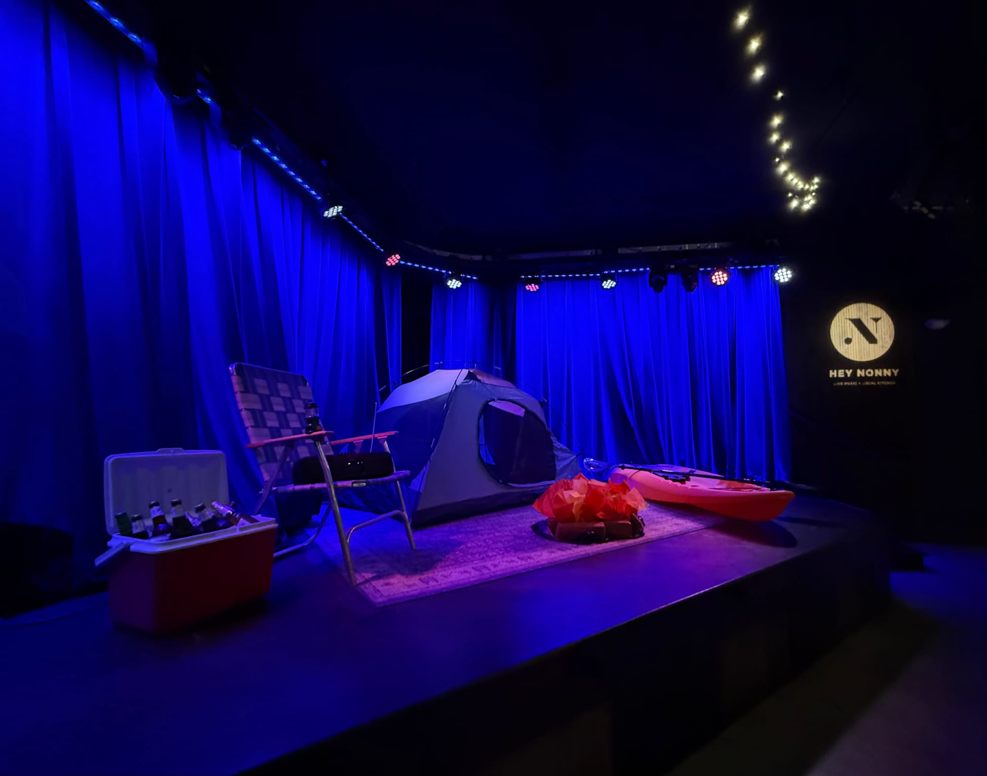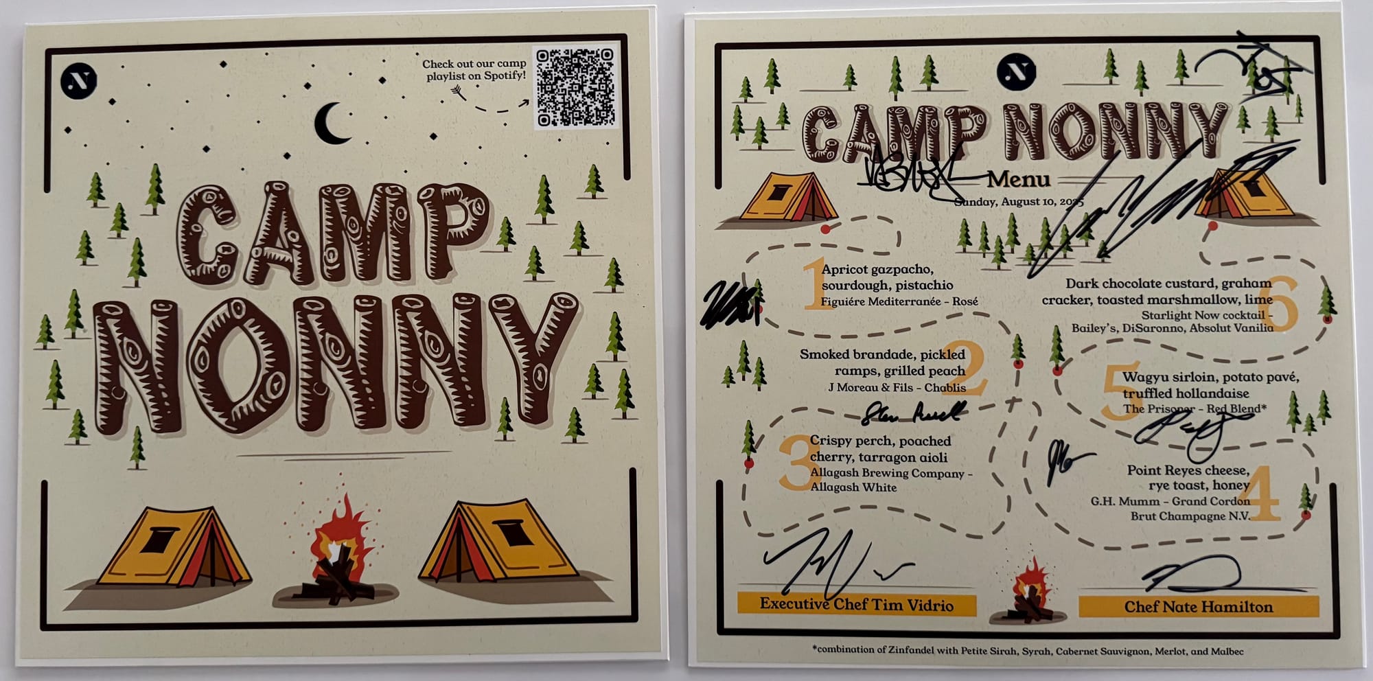 We were greeted with Old Fashioneds, served with the chefs’ high-end interpretation of camp food, and read a ghost story from the stage above. To remember the experience, we were all given souvenir vinyl records with the menu on the back and the autographs of the chefs who made it all happen.